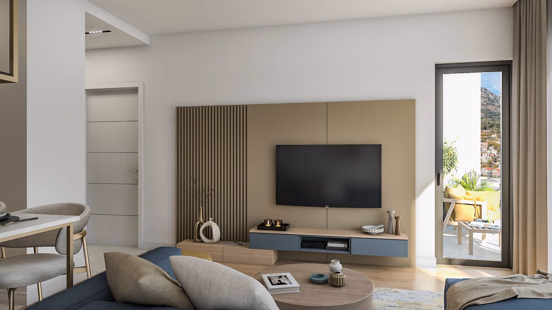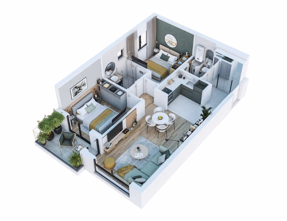 Structure of the apartment: hallway, living room with kitchen and dining table, 2 bedrooms, 2 bathrooms and a terrace. It has a view of the sea and the view of the mountains that surround it. The apartment will be delivered with finished floors, finished tiles, equipped bathroom and equipped air conditioning.
