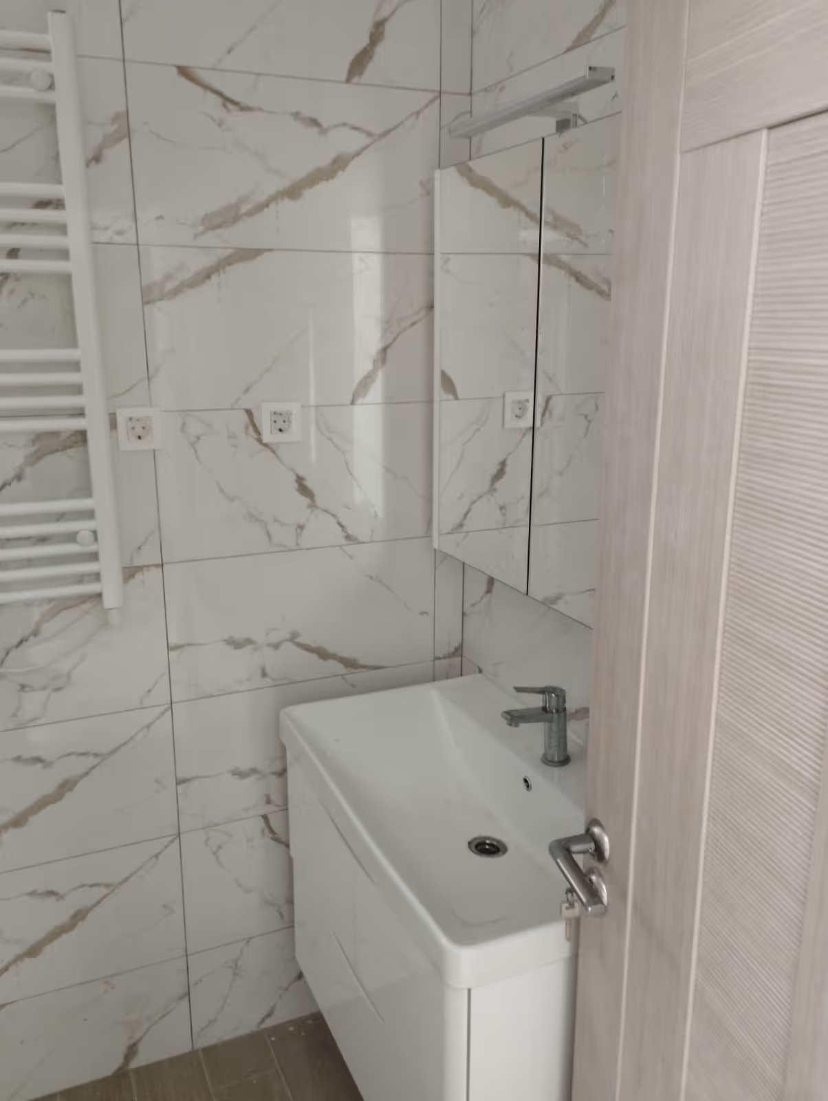 Structure of the apartment: hallway, living room with kitchen and dining table, 2 bedrooms, a bathroom and a terrace. The apartment itself has 62,75 m2, while its terrace has 10,8m2. The apartment has a sea view and the view of the mountains that surround it. The bathroom is fully equipped, the kitchen is equipped with "Bosch" equipment and the apartment has underfloor heating.