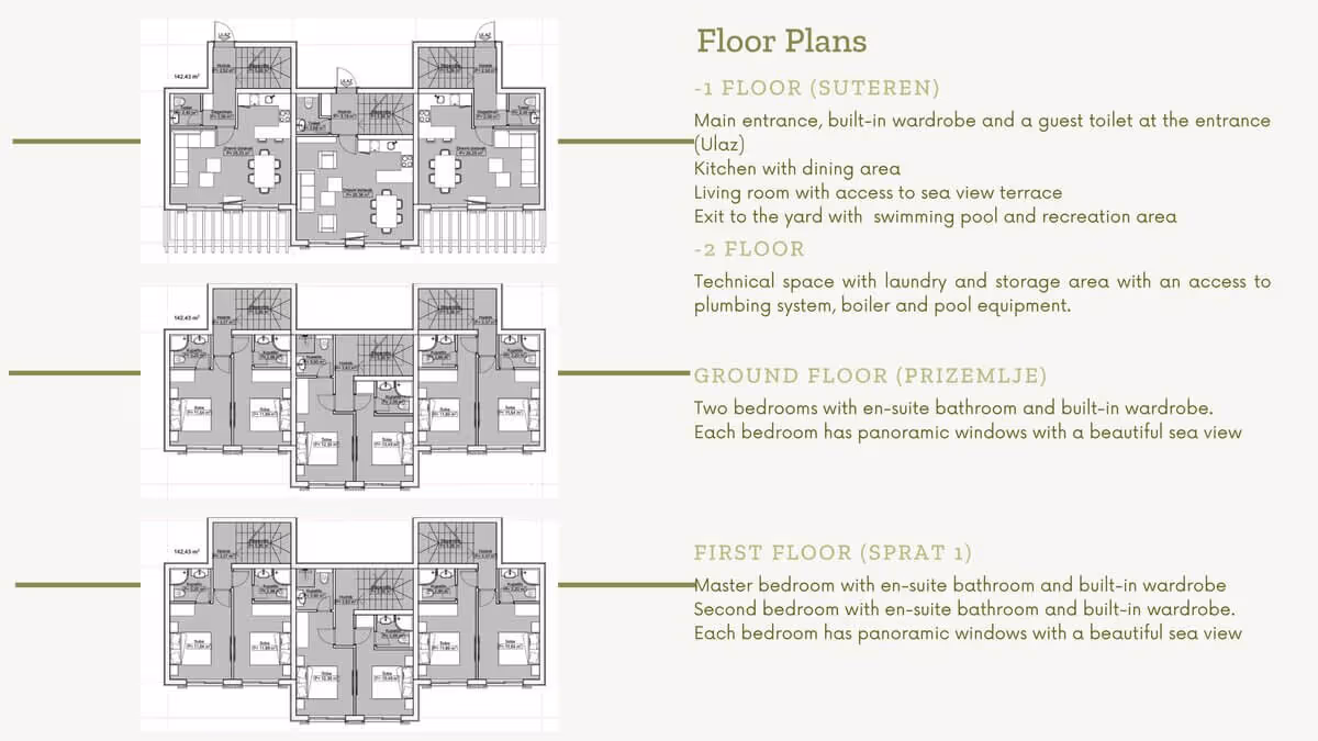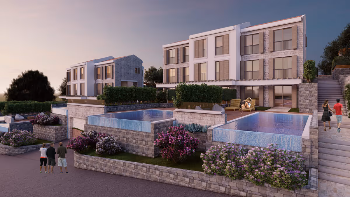 Ova kuća je dio razvojnog projekta koji obuhvata 9 gradskih kuća s bazenima, izgrađenih u tri odvojene zgrade, s 4 spavaće sobe klasičnog ili modernog dizajna. Ukupna površina svake kuće je oko 270 m² uključujući garažu. Projekt će biti završen u martu 2024. godine. Nalazi se u mediteranskom selu u blizini Budve, na jednom od najljepših i netaknutih mjesta na crnogorskoj obali, u intimnom i prirodnom okruženju, na brdu sa spektakularnim pogledom na poluostrvo Sveti Stefan i Budvansku rivijeru.