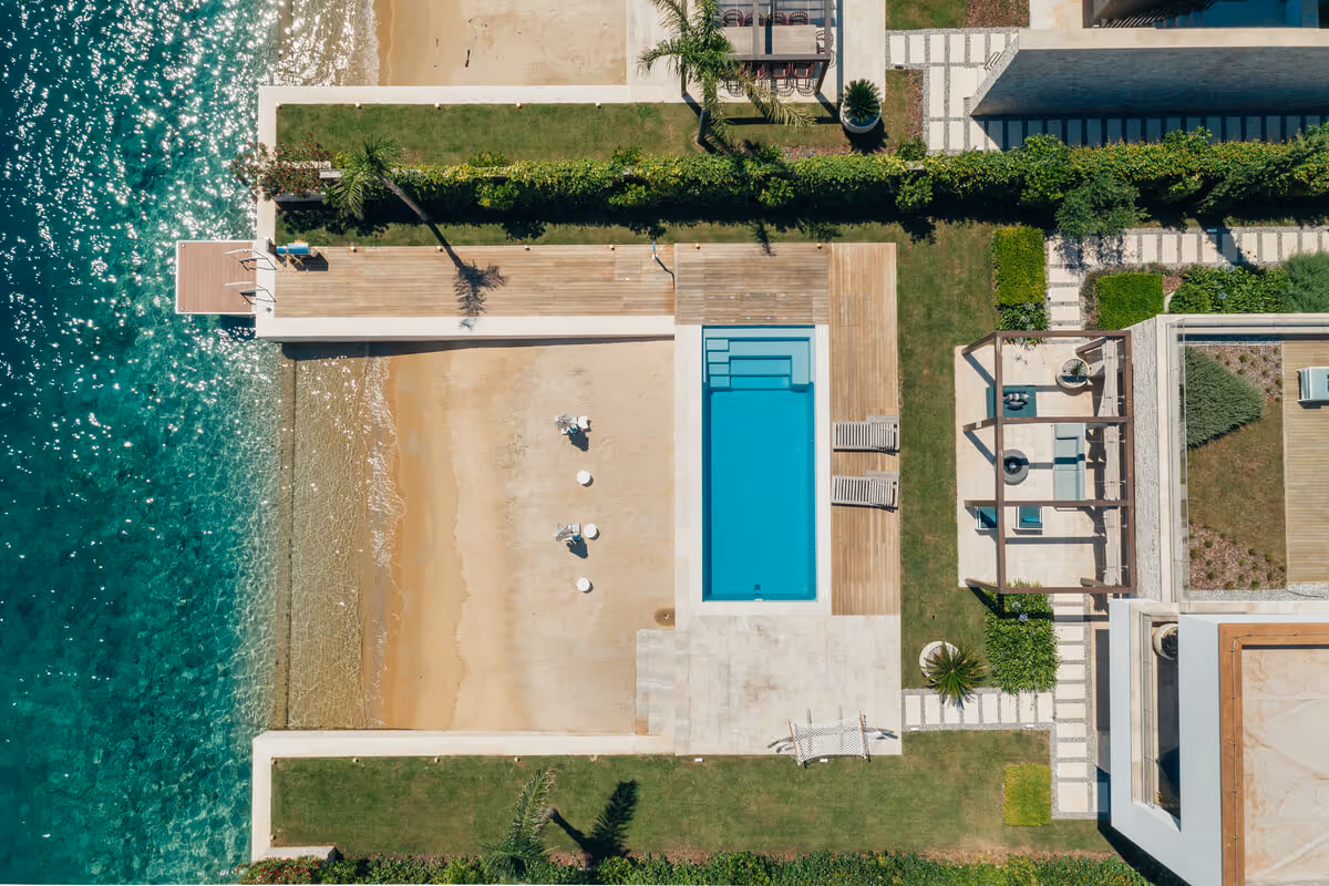 Ground floor: spacious living room with a dining area and a kitchen, guest toilet, laundry, storage, waste room, plant room, and two staff studios, each consisting of a bedroom, bathroom, and kitchenette. There is direct access to the outdoor pool and beach from the living room terrace.