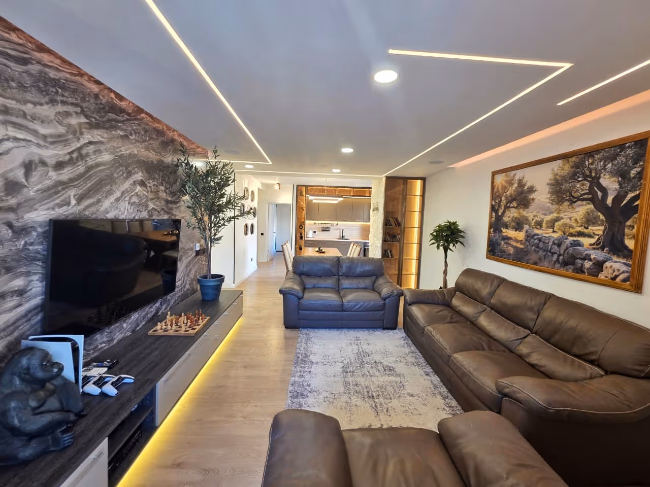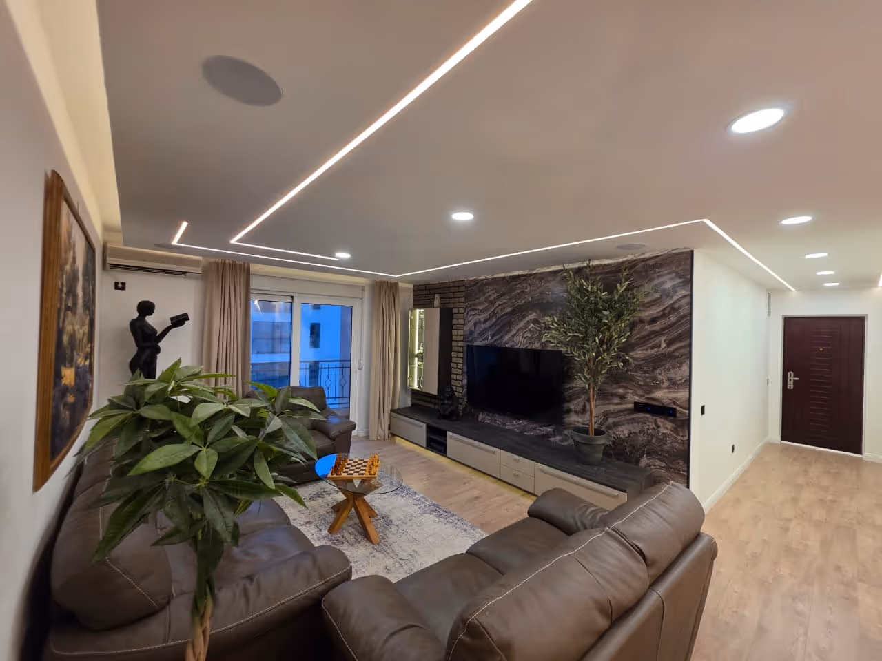 Spušteni plafoni daju moderan izgled enterijeru, dok je dnevni boravak opremljen surround zvučnim sistemom koji pruža unaprijeđeno audio iskustvo. Kuhinja je potpuno opremljena svim potrebnim aparatima.