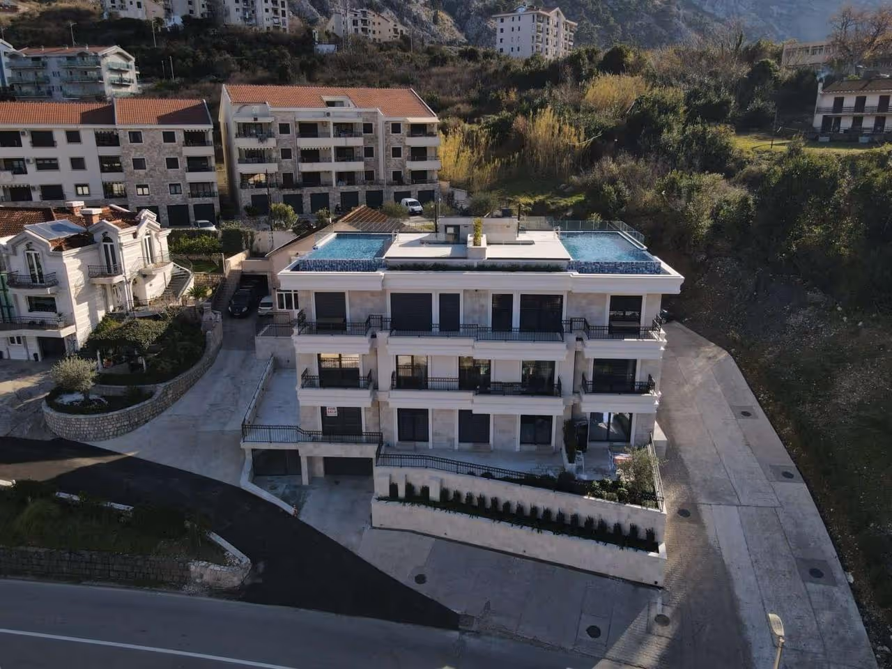 The building has 3 floors, while the apartment is on the 3rd floor. It has 2 pools which are on top of the building and 1 of them belongs to this apartment. The building is connected by an asphalt road to the main road. It is newly built.