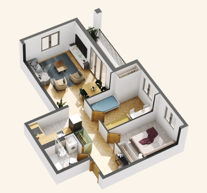 Structure of the apartment: hallway, living room with bed, kitchen and dining table, a bathroom and a terrace. The apartment will be delivered with finished floors, finished tiles, equipped bathroom and air conditioning.
