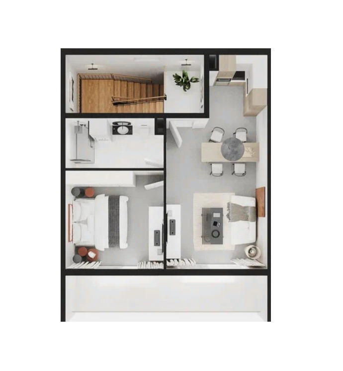 Structure of the apartment: living room with kitchen and dining table, a bedroom, a bathroom and a terrace. It has a view of the sea and the mountains that surround it. It will be delivered with finished floors, finished tiles, equipped bathroom and equipped air conditioning.