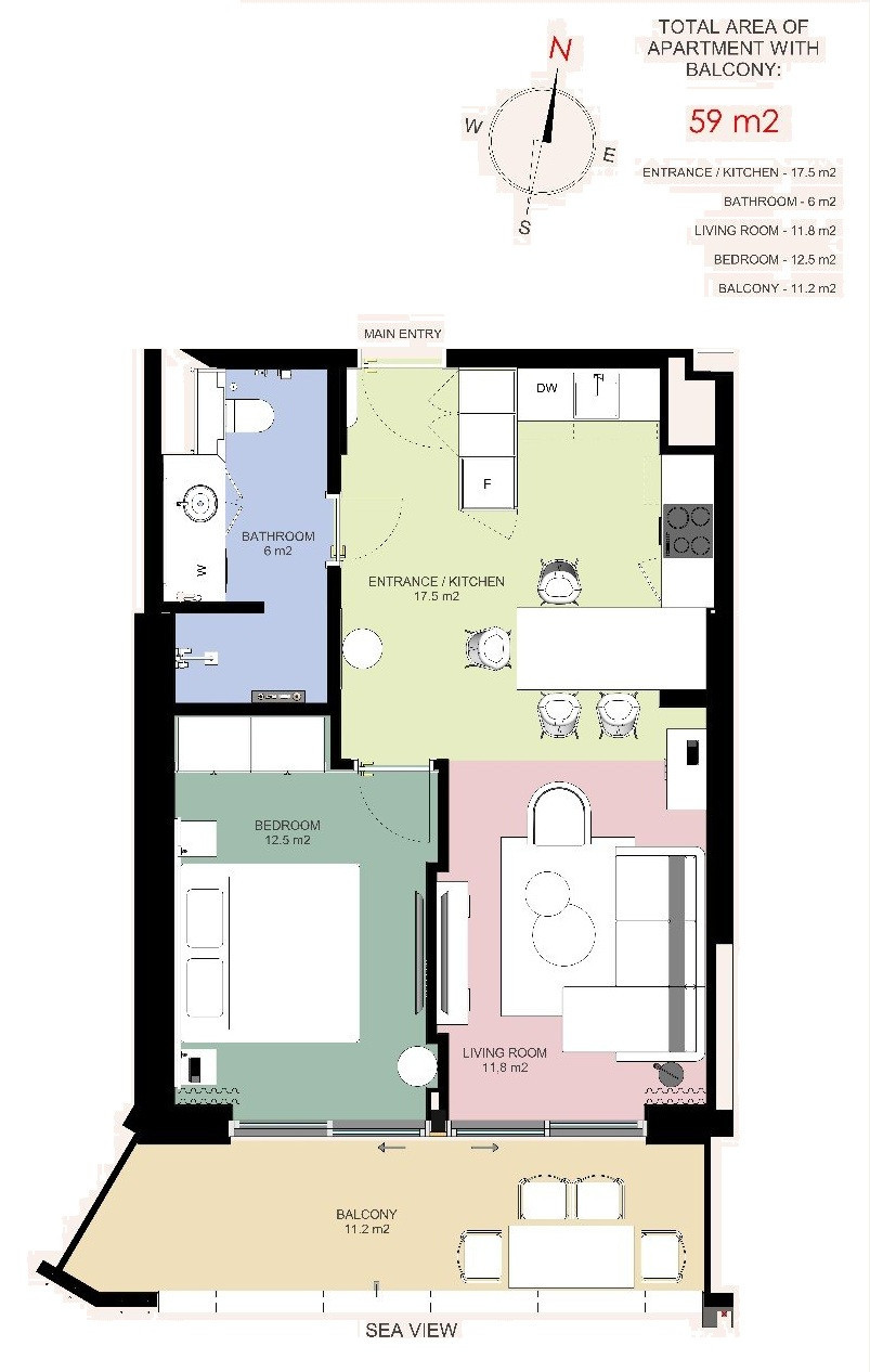 Structure of the apartment: hallway, living room with kitchen and dining table, a bedroom, a bathroom and a terrace. It has a panoramic sea vew and the view of the mountains that surround it. Upon construction the apartment will be fully furnished and ready for moving in.