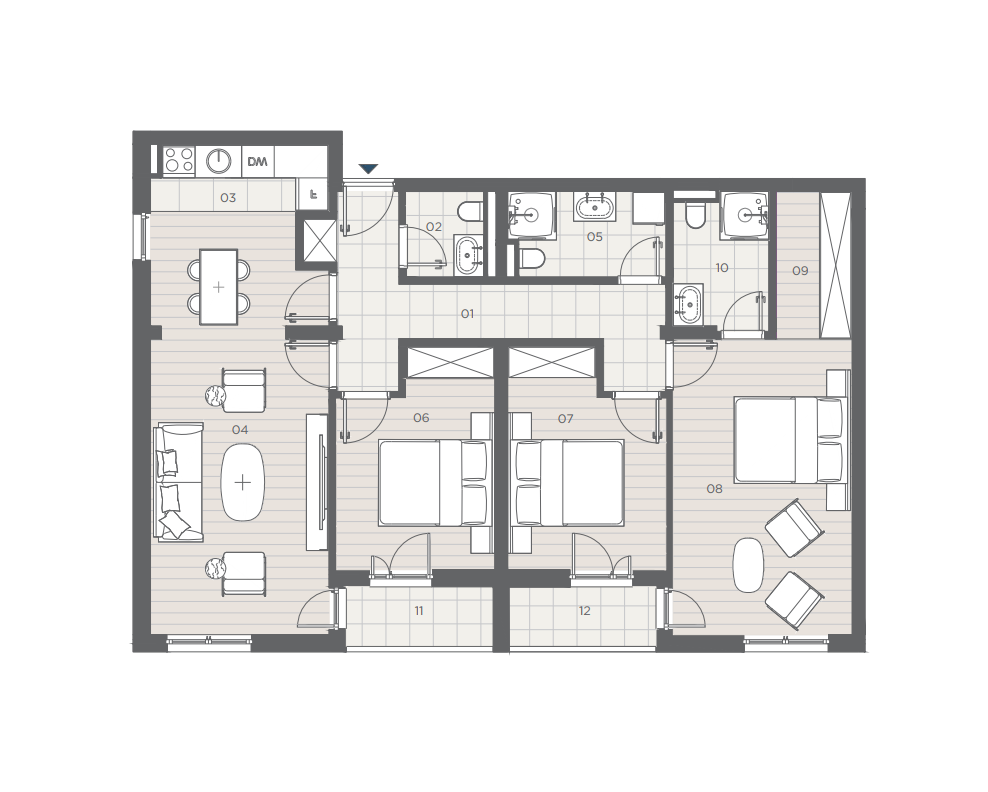 Structure of the apartment: hallway, living room with a kitchen and dining table, 3 bedrooms, 2 bathrooms, a toilet and 2 terraces. It will be delivered with finished floors, finished tiles, equipped bathroom and equipped air conditioning.