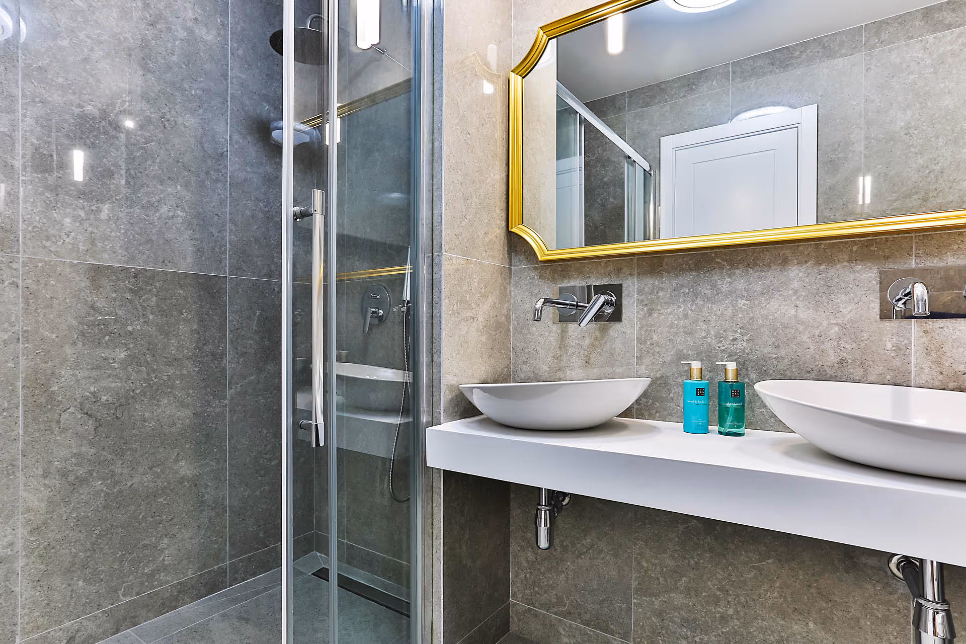 Two bedrooms with en-suite bathroom and built-in wardrobe. Each bedroom has panoramic windows with a beautiful sea view