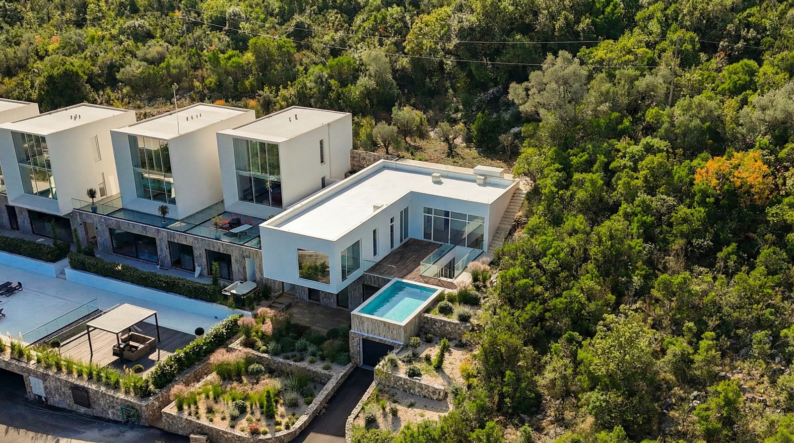 Ovaj završeni projekat sastoji se od 9 apartmana i 2 ekskluzivne vile, dizajnirane da pruže udobnost, privatnost i panoramski pogled. Vila posjeduje privatni bazen, prostranu terasu sa pogledom na zaliv i garažu površine 21 m². Nekretnina je lako dostupna putem asfaltiranog puta povezanog sa glavnom saobraćajnicom, što obezbjeđuje praktičnost uz zadržavanje mirnog ambijenta.
