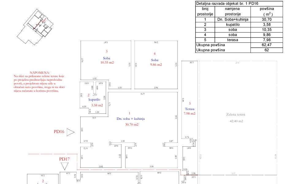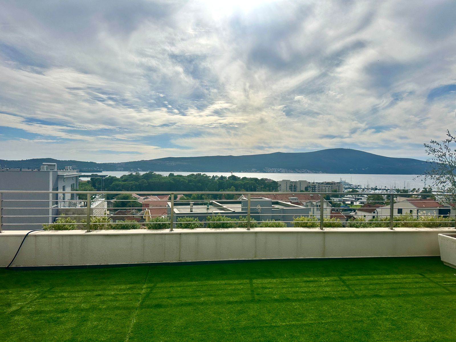 Structure of the apartment: hallway , living room with kitchen and dining table, 2 bedrooms, a bathroom, a terrace and a green terrace. The apartment itself has 62m2, while its green terrace has 42m2. It has a sea view and the view of the mountains that surround it. It is fully furnished and ready for moving in.