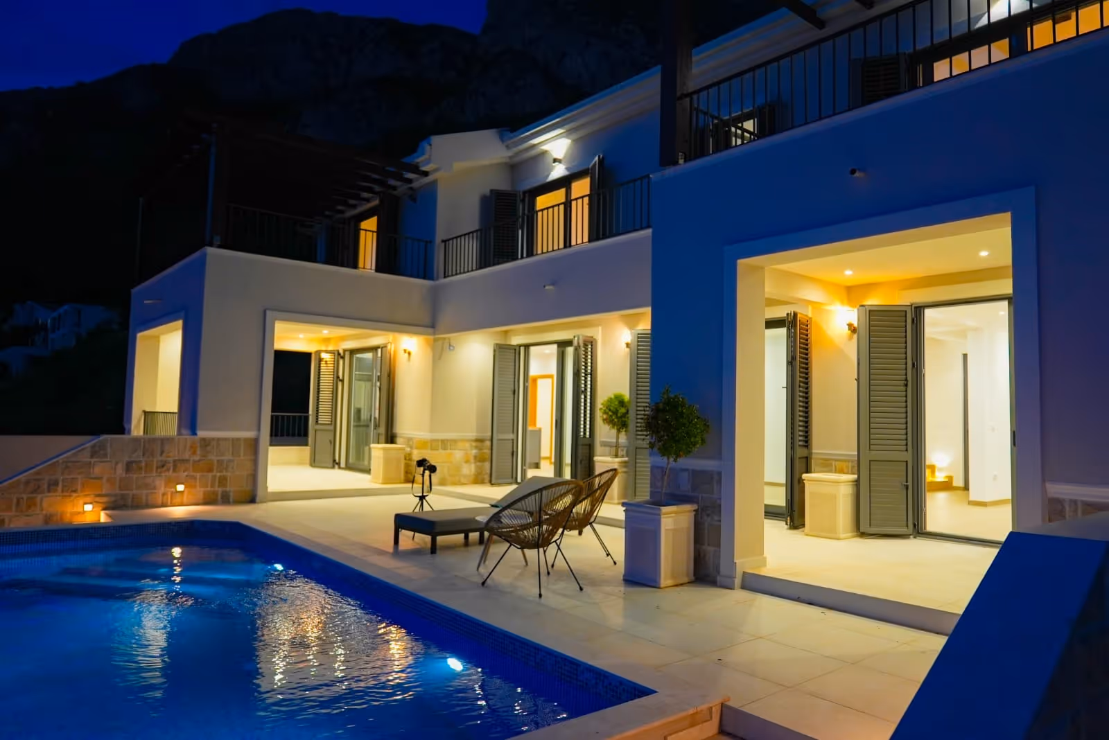 The villa offers panoramic views of the sea as well as the surrounding mountains, creating a unique living experience.