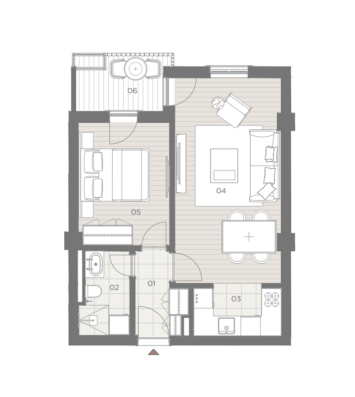Struktura stana: hodnik, dnevna soba sa kuhinjom i trpezarijskim stolom, spavaća soba, kupatilo i terasa. Stan ima pogled na more i planine koje ga okruzuju. Biće isporučen sa završenim podom, završenim pločicama, opremljenim kupatilom i opremljenom klima uređajem.