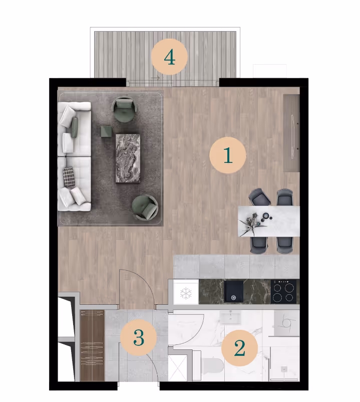 Struktura stana: hodnik, dnevna soba sa krevetom, kuhinja i trpezarijski sto i kupatilo. Stan će biti isporučen sa završenim podovima, završenim pločicama, opremljenim kupatilom i klima uređajem.