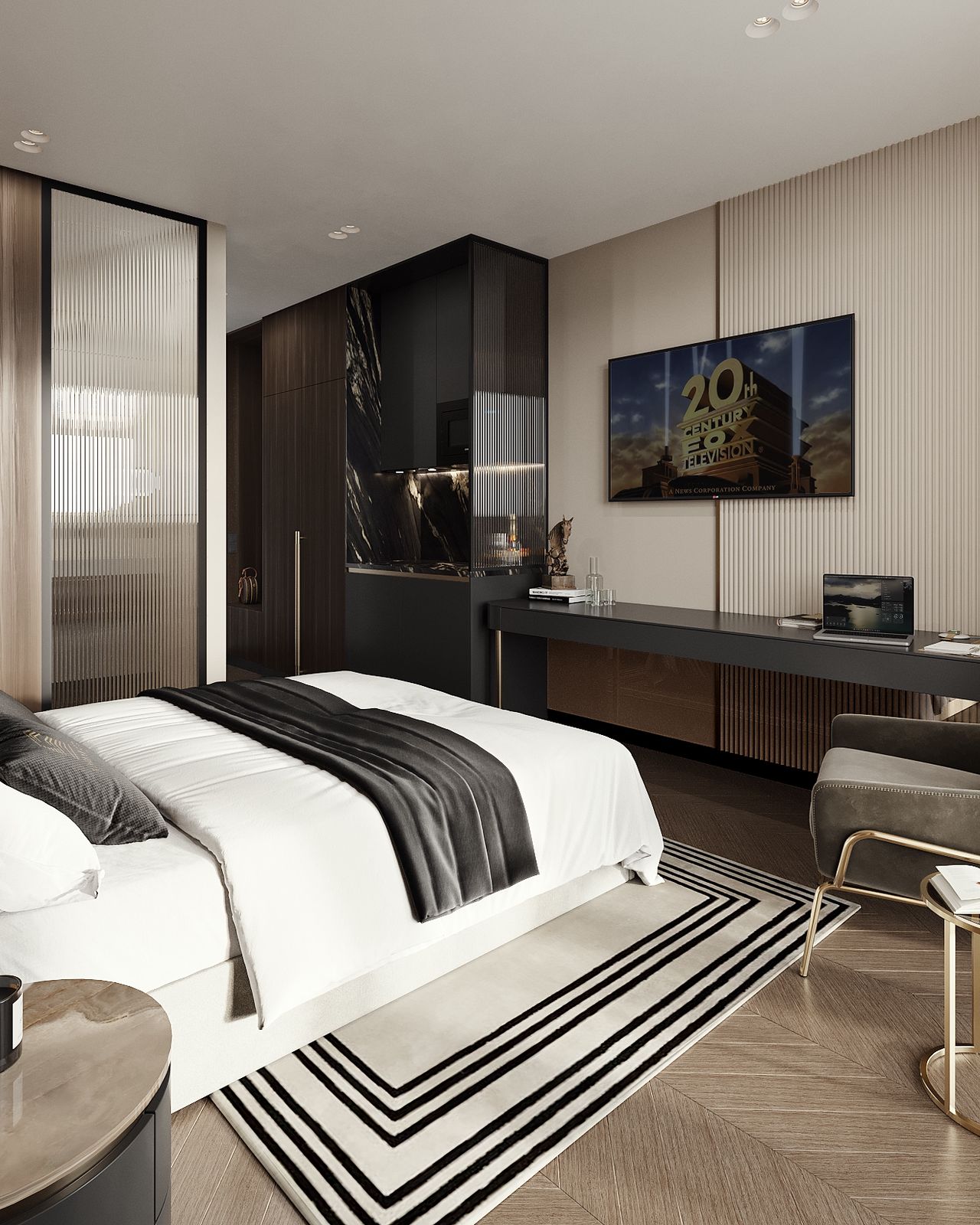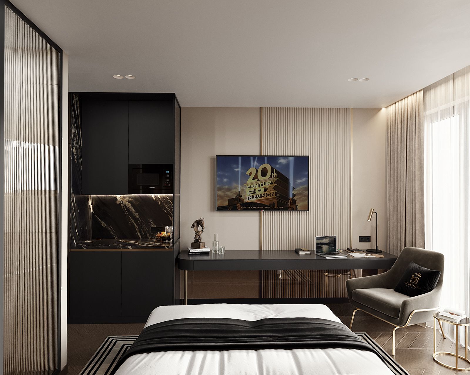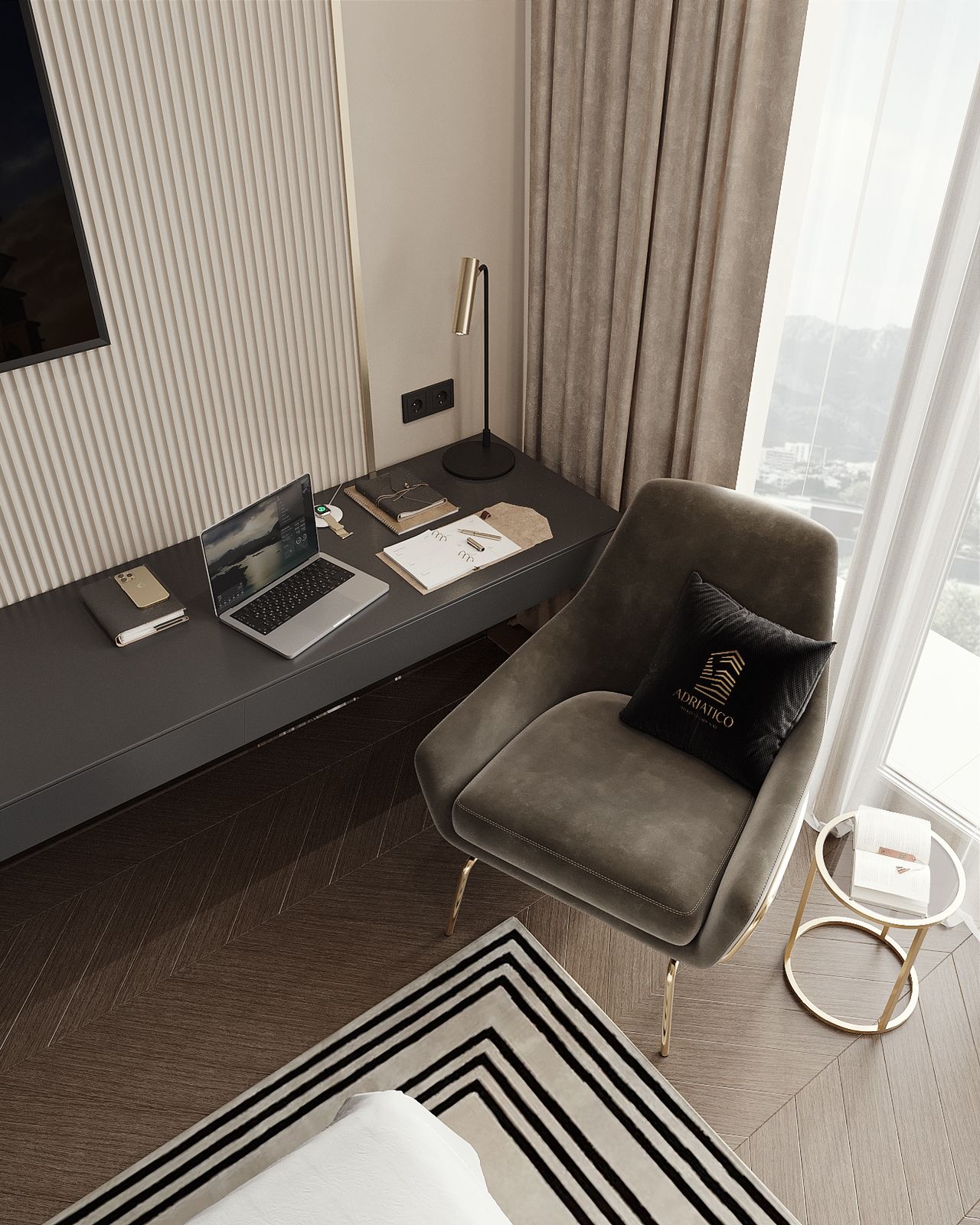 Structure of the apartment: hallway, living room with bed, kitchen and dining table, a bathroom and a terrace. The apartment itself has 24,39m2, while its terrace has 12,96m2. The apartment will be delivered with finished floors, finished tiles, equipped bathroom and air conditioning.