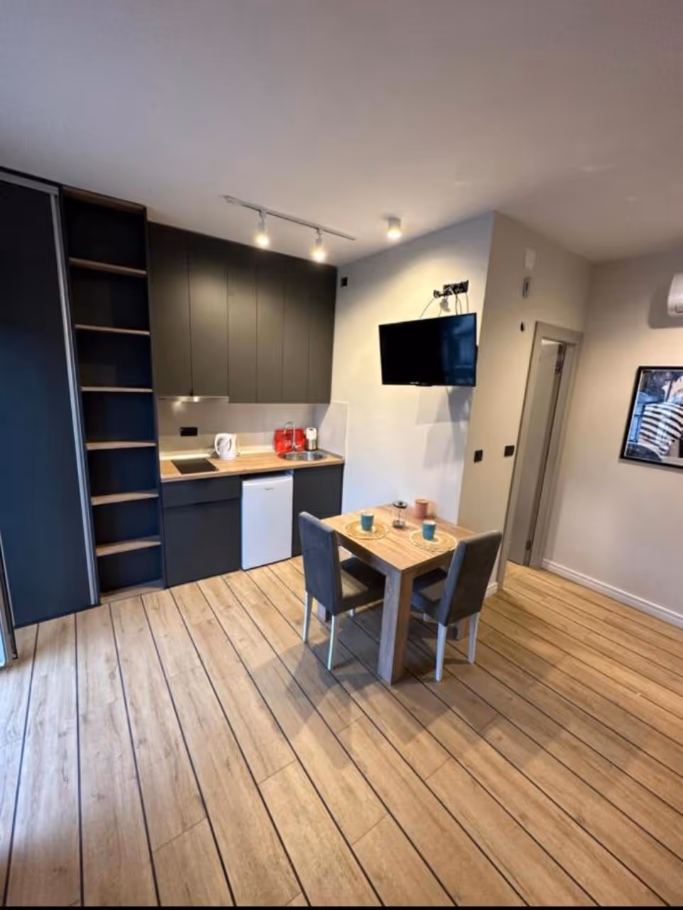 Structure of the apartment: living room with bed, kitchen and dining table, a bedroom and a terrace. It is fully furnished and ready for moving in.