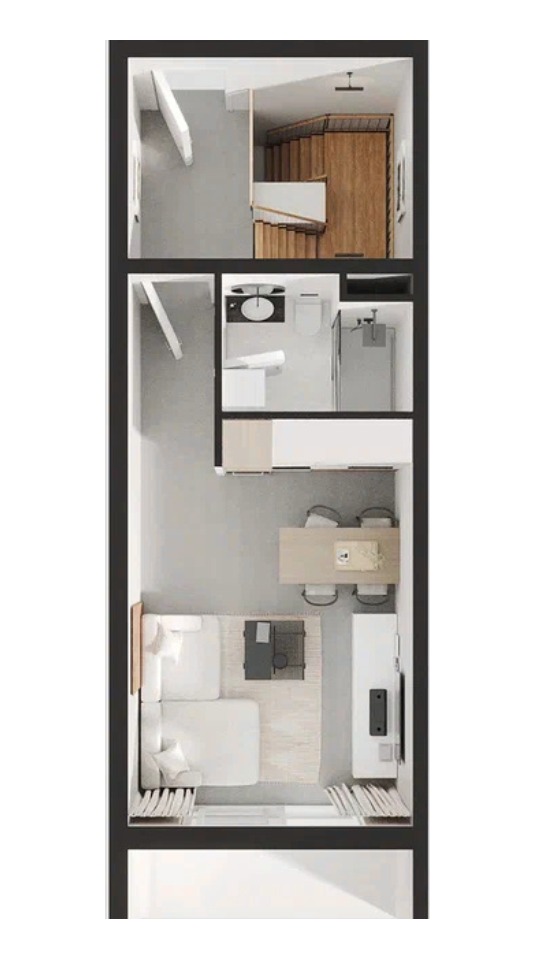 Structure of the apartment: living room with bed, kitchen and dining table, a bathroom and a terrace. It has a view of the sea and the mountains that surround it. It will be delivered with finished floors, finished tiles, equipped bathroom and equipped air conditioning.
