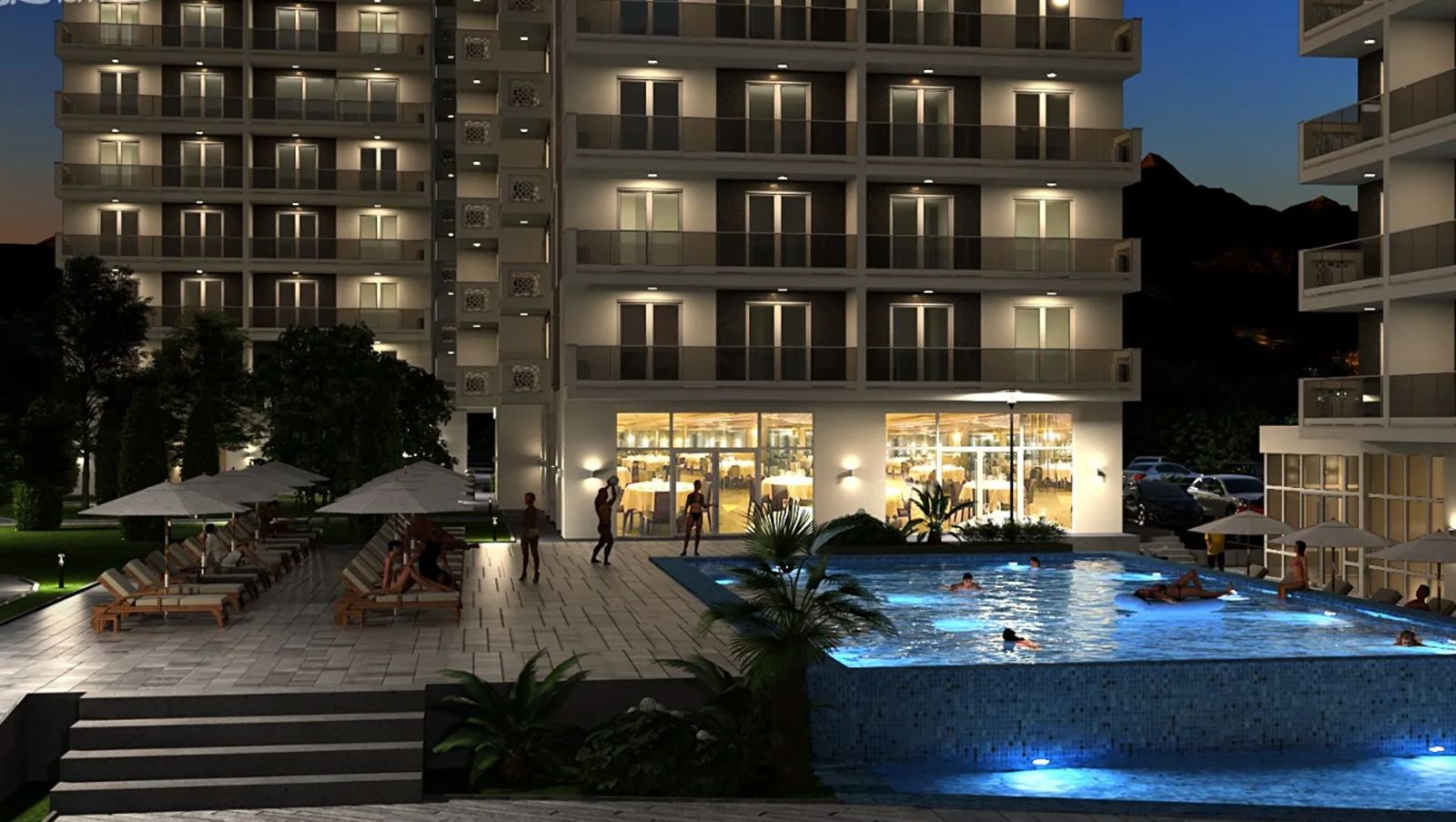 A rare concept for a residential complex in Montenegro: a green oasis on a private territory of 1.3 hectares with a SPA center, reception in each building, it has its own garage for cars, its own restaurant and service sphere. For adults - there is a pool measuring 23 x 10 meters, with a depth of 1.4 meters, and for children - with slides, like in an aqua park, a pool measuring 4 x 2.5 meters, with a depth of 0.6 meters. A 15-minute walk away is the Bar city stadium with a soccer field and running tracks. Also, there is a swimming pool and SPA. Nearby is Dvorac Sportova with a basketball hall and a fitness center. Our own fitness center is planned on the territory of our complex.