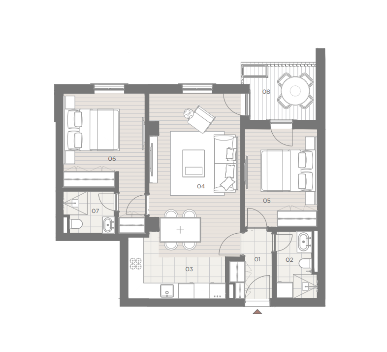 Struktura stana: hodnik, dnevna soba sa kuhinjom i trpezarijskim stolom, 2 spavaće sobe, 2 kupatila i terasa. Stan ima pogled na more i planine koje ga okruzuju. Biće isporučen sa završenim podom, završenim pločicama, opremljenim kupatilom i opremljenom klima uređajem.