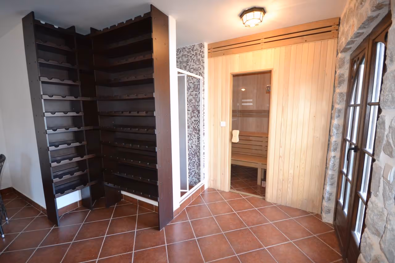 In the basement there is a tavern, a sauna, storage room and a garage.